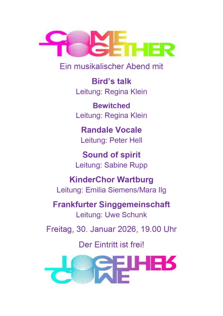 Wir proben Donnerstags um 20:00 Uhr im Gemeindesaal der Ev. Wartburggemeinde, Hartmann-Ibach-Straße 108, 60389 Frankfurt/Bornheim